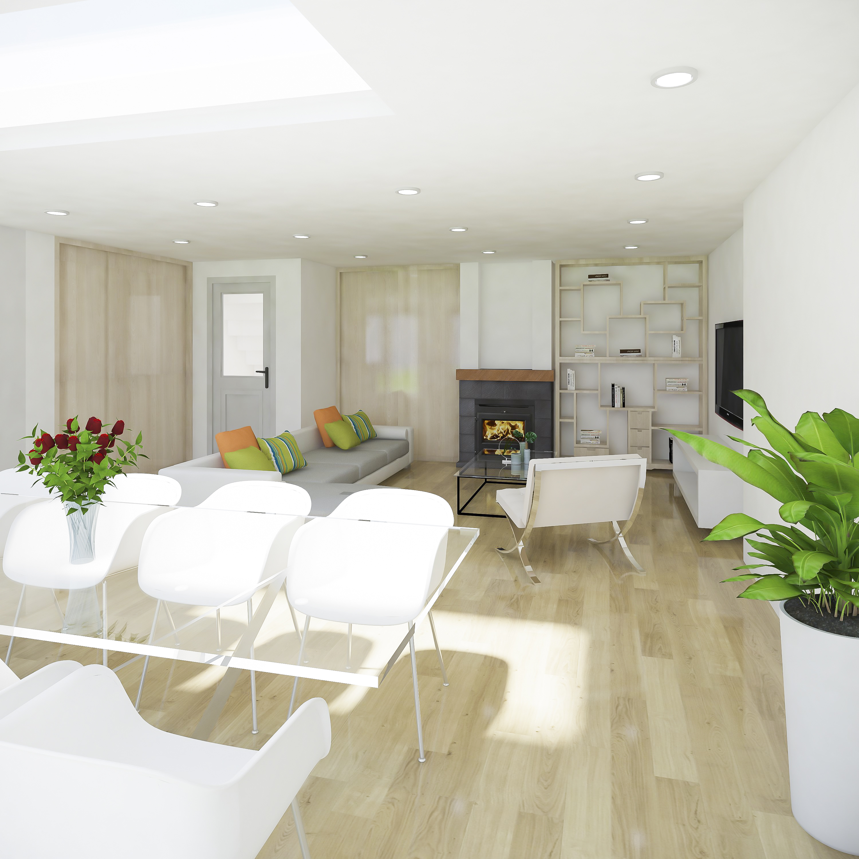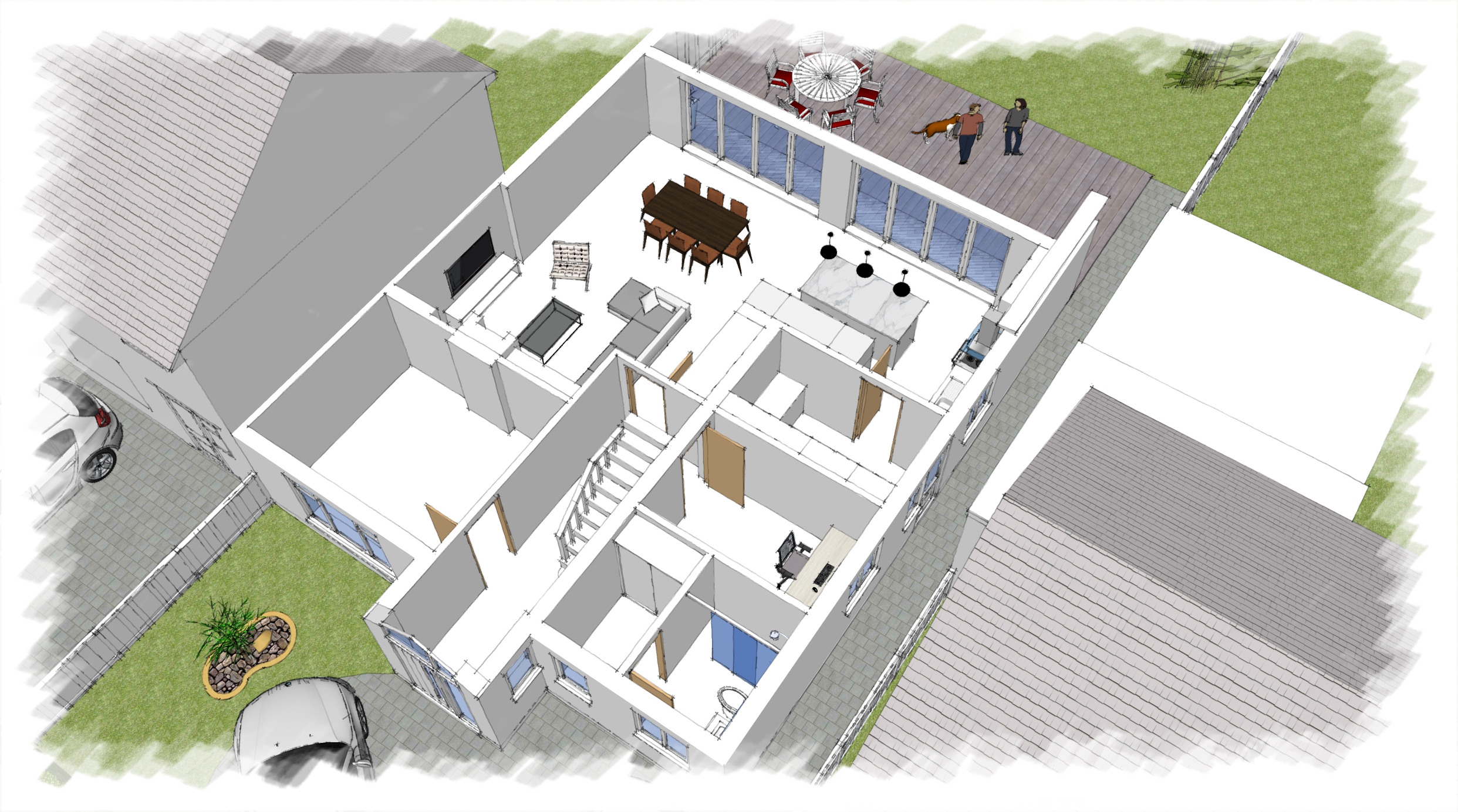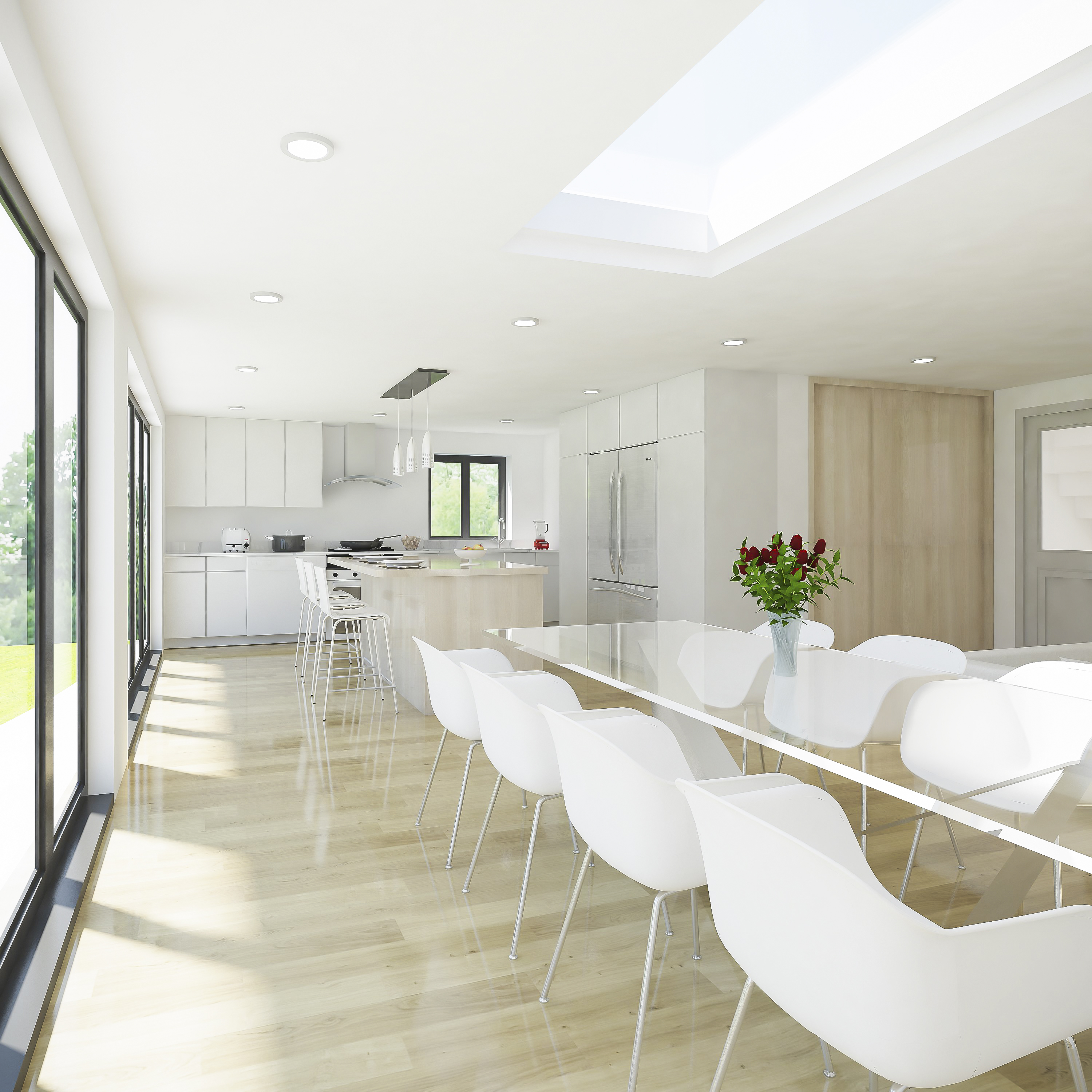 - Large open plan kitchen dining area with a visual connection with the rear garden.