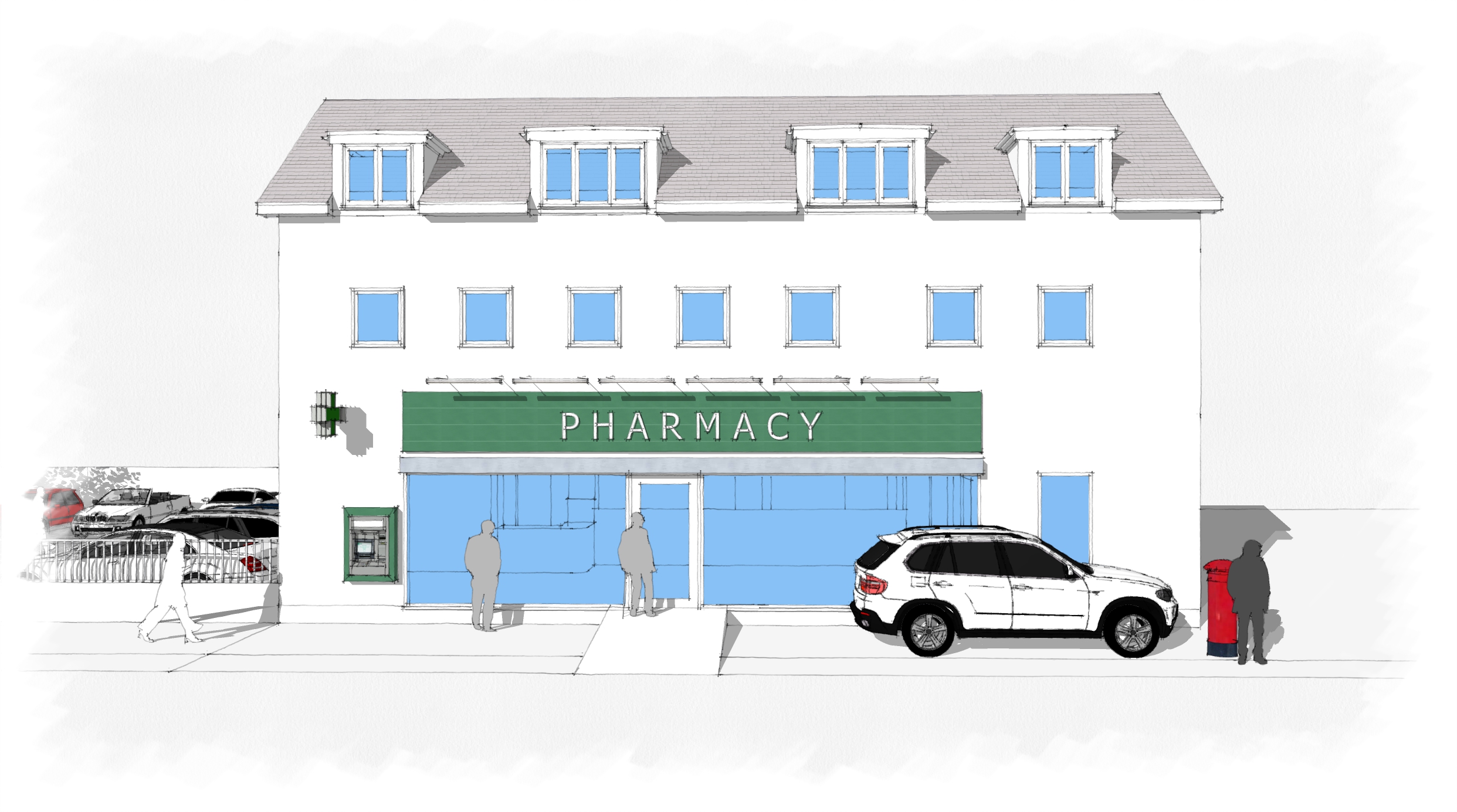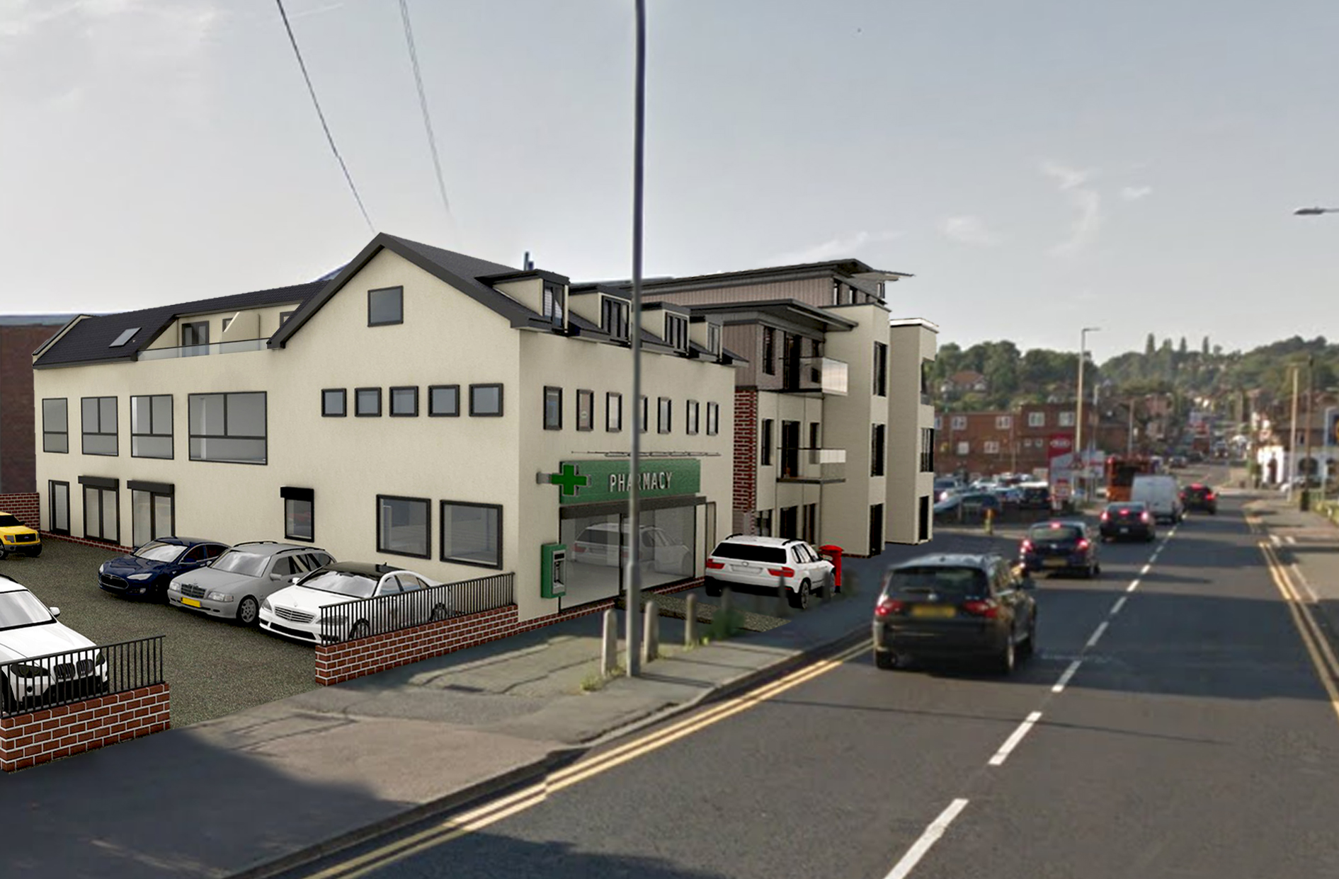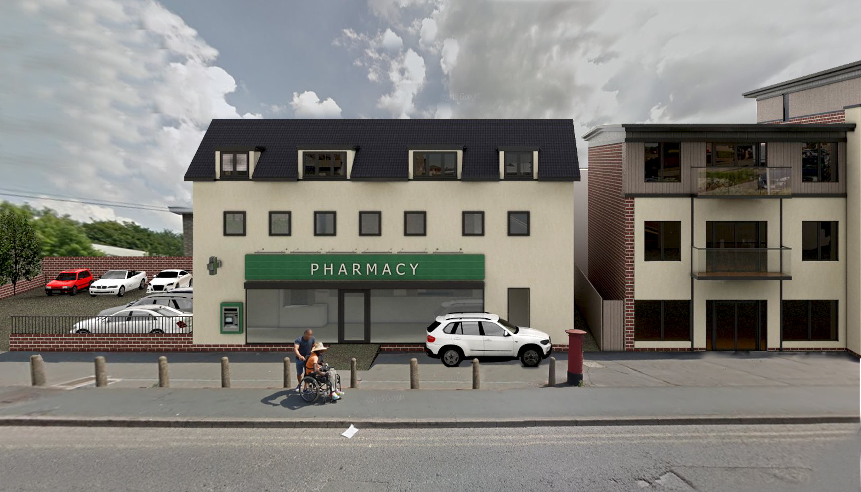 Change of Use - Former Bank to A1 (Pharmacy) + Erection of x4 Residential Flats Over