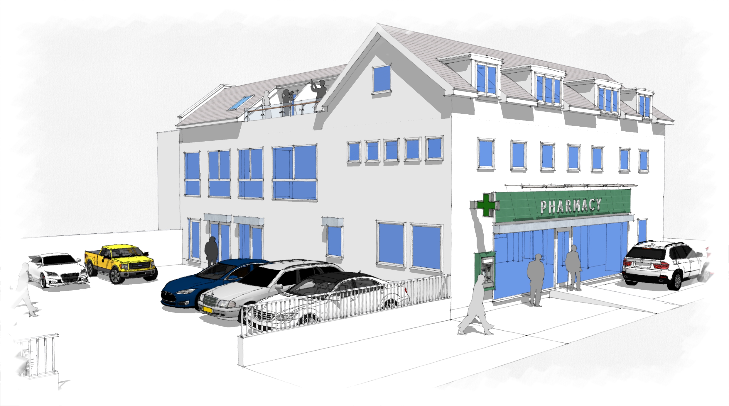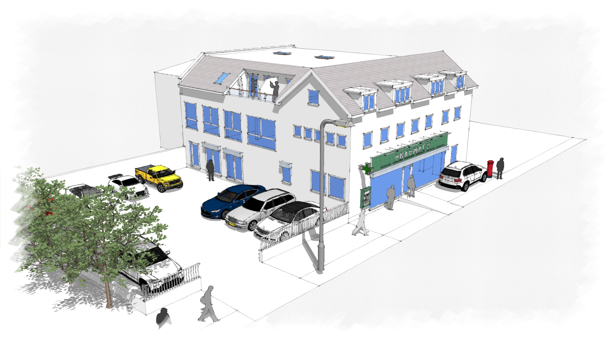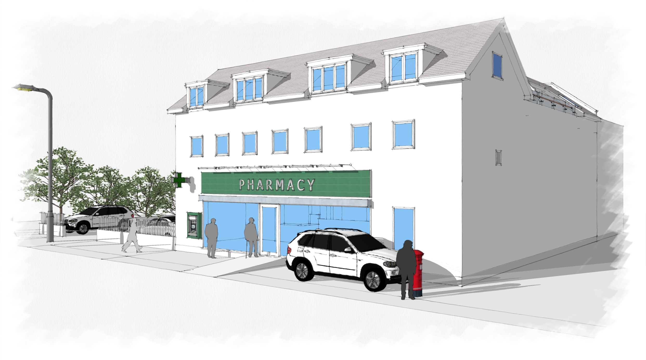 Change of Use - Former Bank to A1 (Pharmacy) + Erection of x4 Residential Flats Over